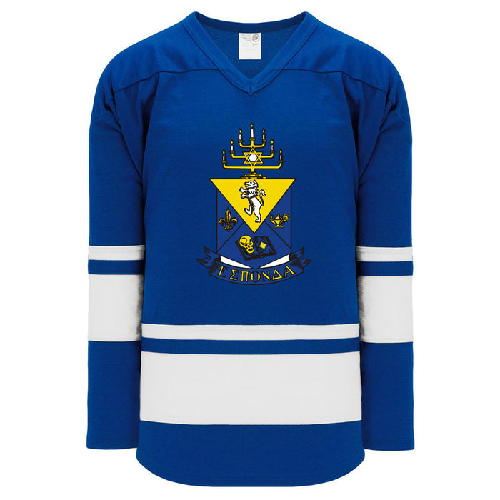 Alpha Epsilon Pi League Hockey Jersey comes in Royal, Black, Purple, Red, Navy & More colors. Oversized hockey cut Reinforced construction Two-color incline design with accent piping Contrast color angled yoke & collar