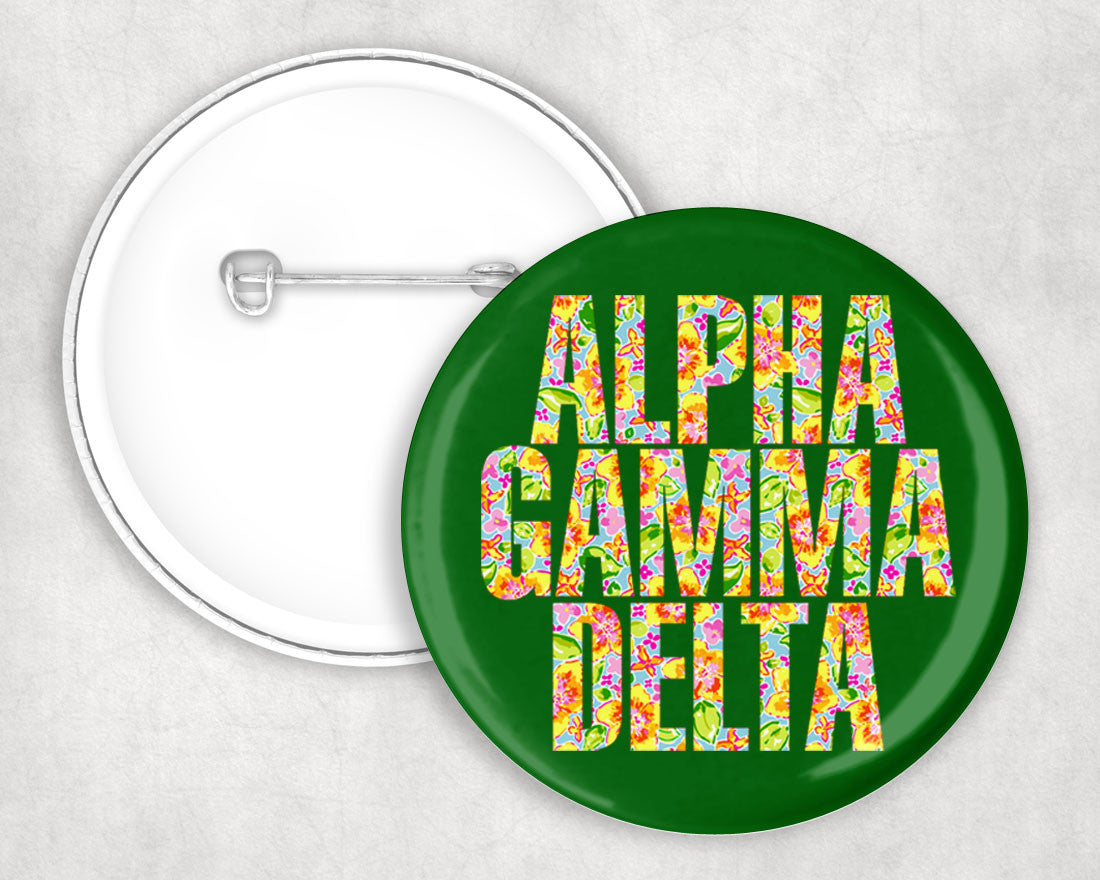 Alpha Gamma Delta Floral Pin Buttons measures 2.25" round and comes with standard locking pin back style button. Comes as shown.