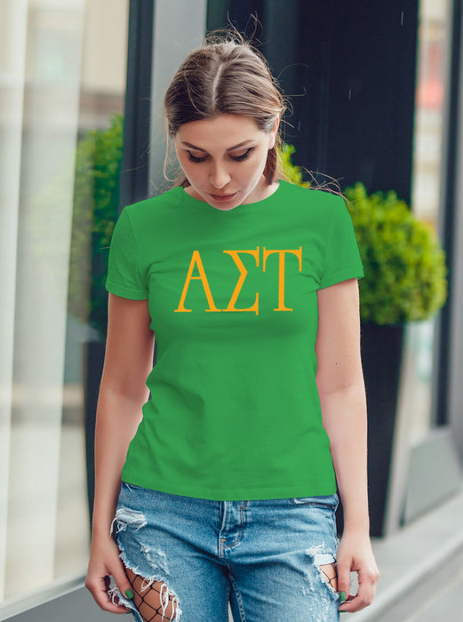 Alpha Sigma Alpha Greek University Font printed t-shirt has been a classic for years. 100% cotton unisex soft cotton tee with your letters printed big and bold on the front.