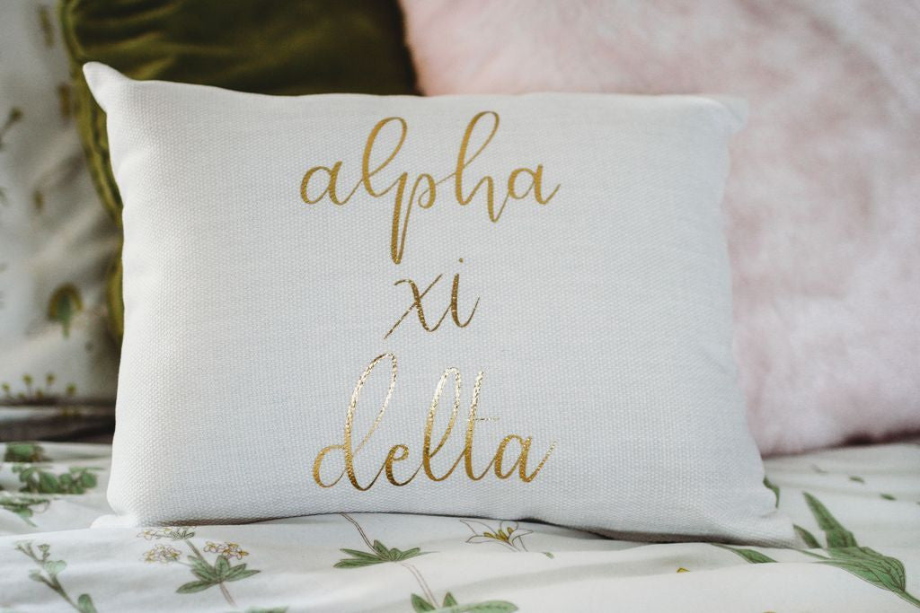 Alpha Xi Delta Gold Imprint Throw Pillow. Throw Pillows; perfect for your dorm, bedroom or sorority suite! Size: 12