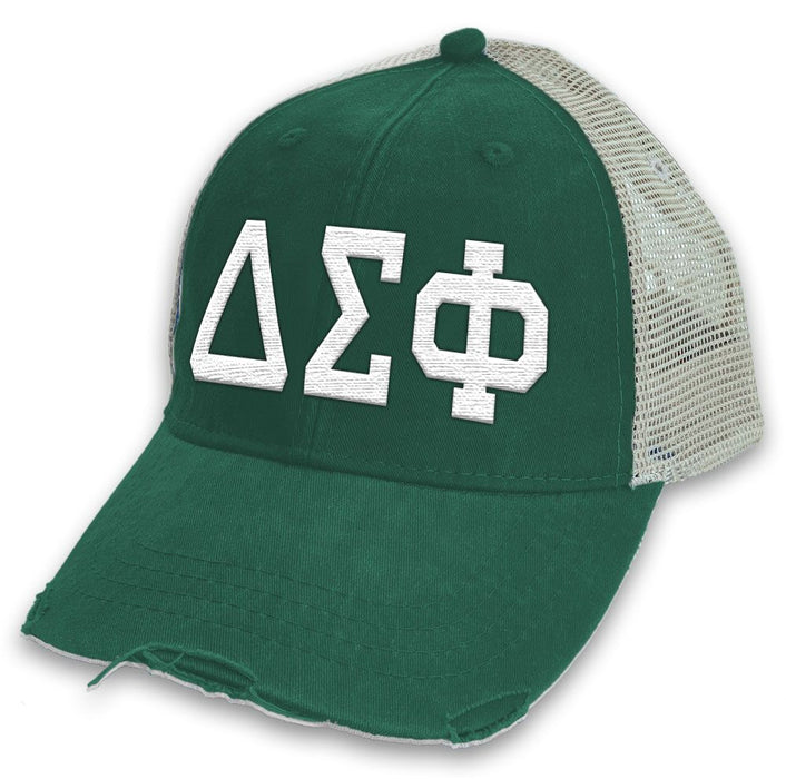 Delta Sigma Phi Distressed Trucker Hat is 6-panel, structured, mid-profile pigment-dyed front panels traditional tan nylon mesh back panels distressed torn visor, cotton twill sweatband; four rows of stitching on bill plastic tab back closure; Cool-Crown™ mesh lining