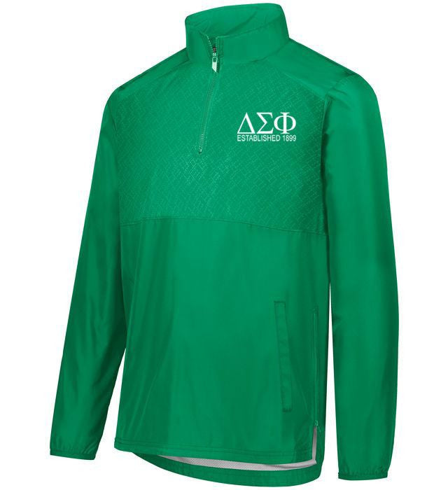 Delta Sigma Phi SERIESX PULLOVER. Micron™ polyester is a lightweight, wind/water-resistant fabric Embossed inserts for subtle textured pattern Micromesh lined nylon body Taffeta lined sleeves Woven label Quarter zip pullover style with zipper garage Set-in sleeves Front pockets Spandex bound cuffs Side seam zipper for easy on/off Dropped tail with side vents