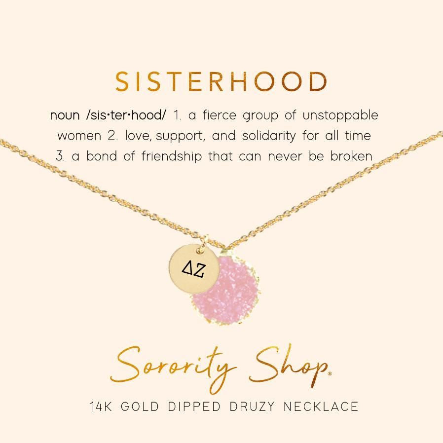 Delta Zeta Sisterhood Druzy Necklace. * Chain Measures 18 inch * 14k gold plated * 12 mm Natural Druzy Stone * 10 mm disc with sorority letters engraved