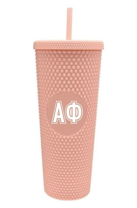 Alpha Phi Take your sorority spirit to go with our Studded Sorority coral colored Tumblers 24oz cup with a leak proof lid and straw.