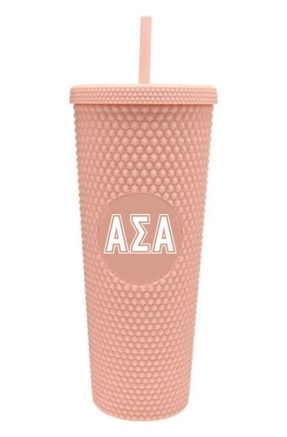 Alpha Sigma Alpha Take your sorority spirit to go with our Studded Sorority coral colored Tumblers 24oz cup with a leak proof lid and straw.