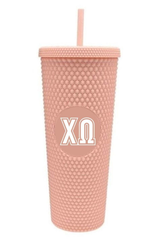 Chi Omega Take your sorority spirit to go with our Studded Sorority coral colored Tumblers 24oz cup with a leak proof lid and straw.