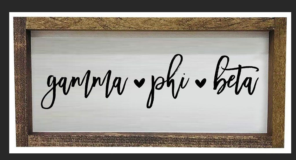 Gamma Phi Beta Script Wooden Signs. Each wooden sign features a brushstroke script with heart detailing on canvas and bordered with a wooden frame. * Measures 17" W x 9" H x 1" D
