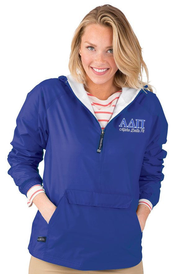 Alpha Delta Pi Circle Monogrammed Anorak. Our simple, classic sewn sorority letters make this jacket an instant must have. This wind and water resistant nylon jacket comes in a variety of colors, and you get to pick your favorite thread color.