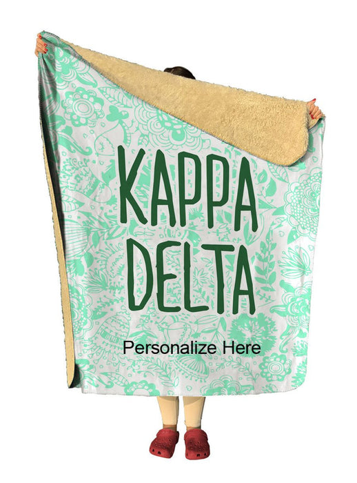 Kappa Delta floral-sherpa-lap-blanket. Soft and smooth velvetytouch front with tan Sherpa back Yarn stitched edges Made of 100% polyester Approximate size: 50" Wide x 60" Long. Machine washable in cold water. Tumble dry on low.