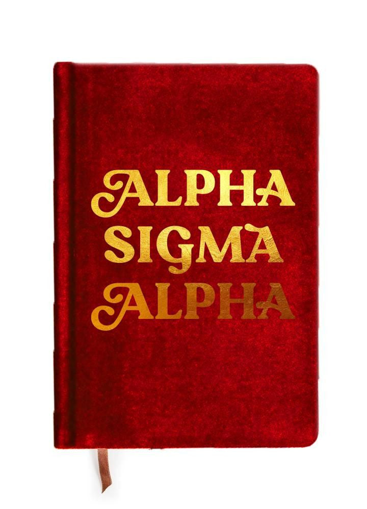 Alpha Sigma Alpha Velvet Notebook. Luxuriously covered in crushed velvet featuring your Sorority name in gold foil PERFECT SIZE: 216 Ruled pages 5.75" 8.25" x 0.56" SATIN BOOKMARK: Features a satin ribbon bookmark to know where you left off.