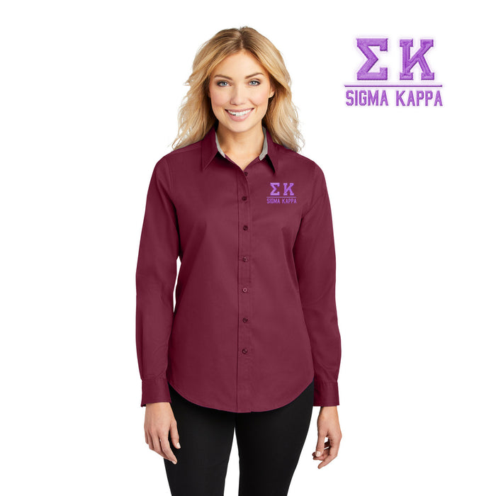 Sigma Kappa Greek Letter Oxford. Our simple, classic sewn letters make this Oxford an instant must have. This Polyester 4.5 ounce wrinkle resistant cotton/poly Oxford comes in a variety of colors, and you get to pick your favorite thread color & a Line of personalization for your school, chapter or nickname. Order more and save.