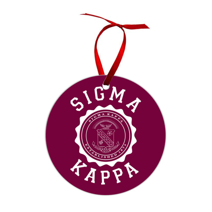 Sigma Kappa Shield Metal Christmas tree ornaments are durable and will bring holiday cheer for years to come. Their surface is scratch and chip-resistant, so they can be stored together in the famous Christmas decoration box. Note that there's one ornament per pack, and it already comes with a separate red ribbon for hanging.