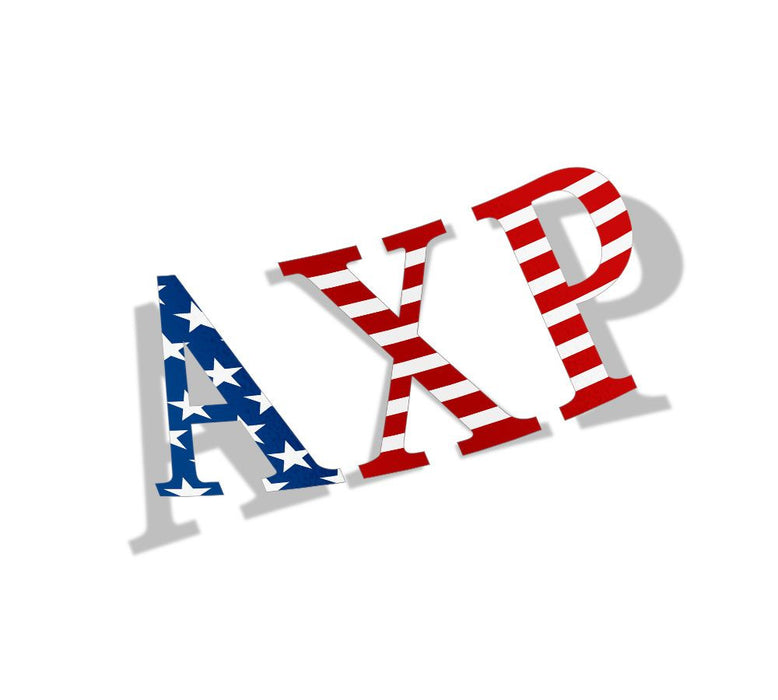 Alpha Chi Rho Greek American Flag Sticker. Support "merica with these awesome American Flag Greek Letter Sticker - 2.5" Tall. The first letter is the beautiful stars and the additional letter or two is the awesome stripes of our American Flag. stickers measure approximately 2.5" tall and are perfect for autos, laptops, water bottles, coolers, boats, doors, etc.