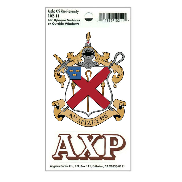 Alpha Chi Rho Crest - Shield decal. They are for opaque surfaces or the outside of windows. Decal measures approx. 3" and comes with an additional decal with just your greek letters.