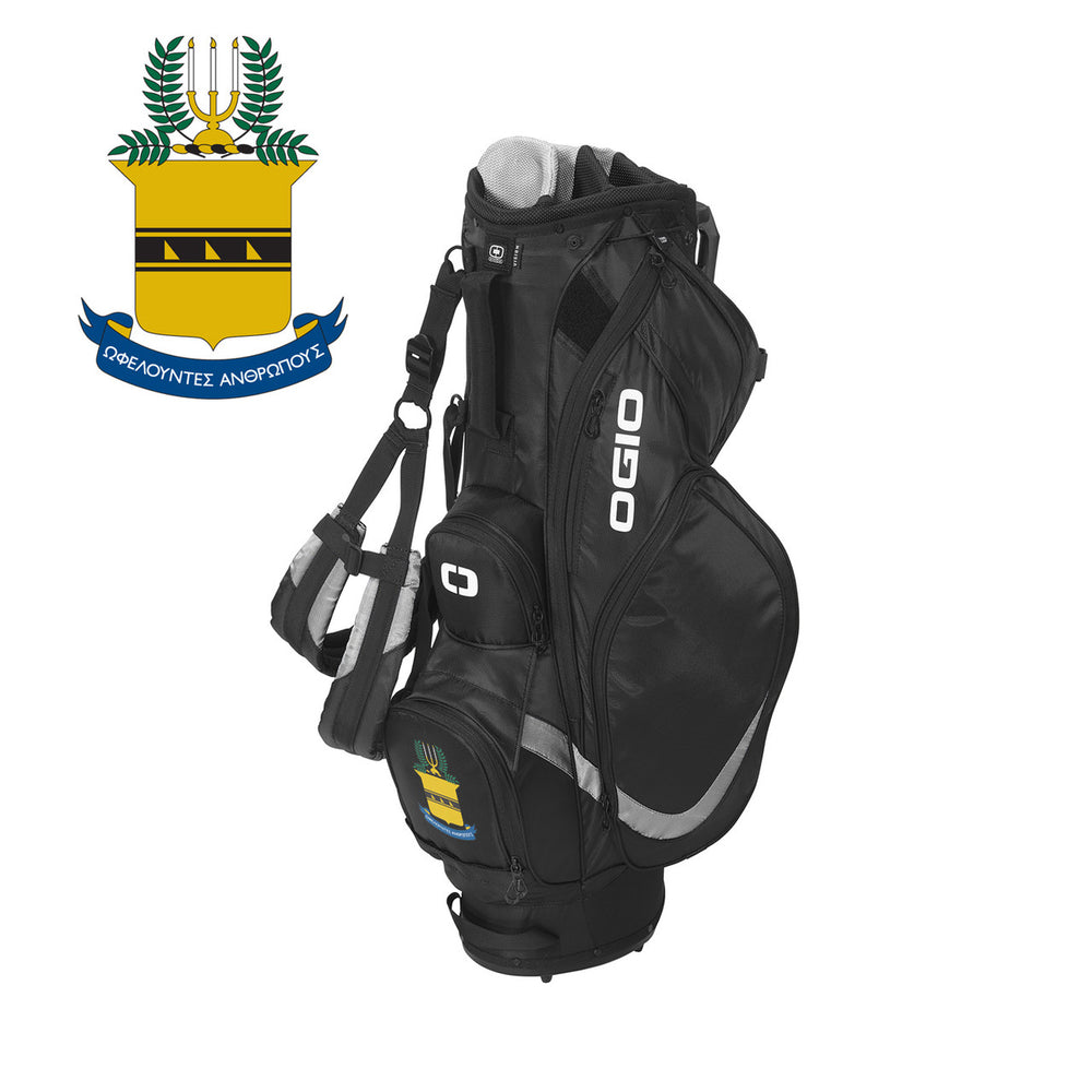 ACACIA Ogio Vision 2.0 Golf Bag. This stand bag is truly a vision of OGIO quality and innovation with two detachable pockets for easy embellishment. Triple Triangle suspension shoulder strap system with 6 zippered pockets, walking-accessible water bottle holster, hook and loop glove patch & rain hood.