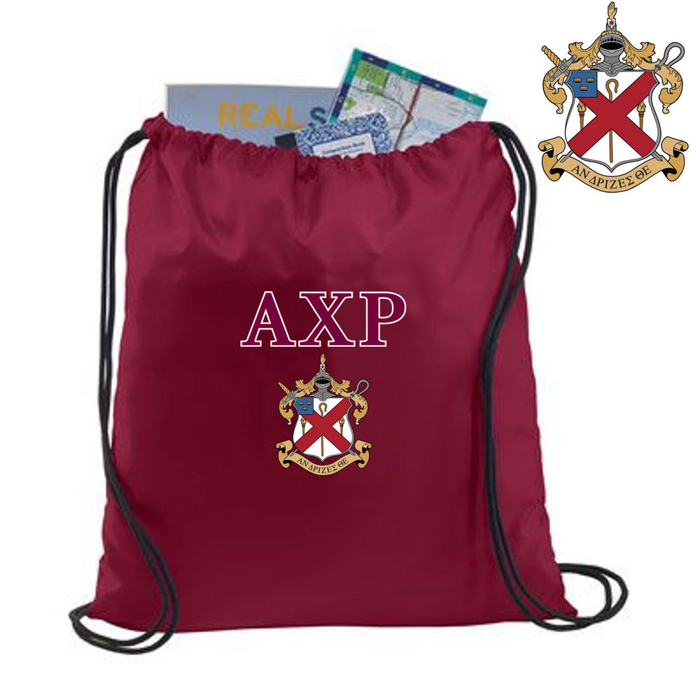 Alpha Chi Rho Crest - Shield Cinch Sacks comes printed with your groups full color Crest - Shield! New blend material with reinforced corners. Drawstring runs through a metal grommet on the reinforced corners.
