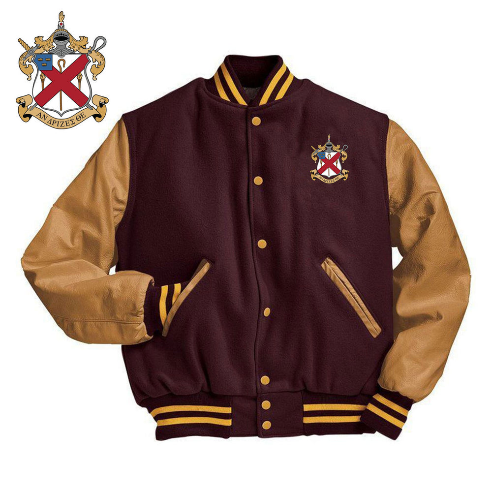 Alpha Chi Rho Varsity Jacket is made of Melton Wool, 24 oz. Genuine leather sleeves and pocket welts Quilted lining Full-snap front High quality rib-trim collar,cuffs, and bottom hem Easy-entry front pocket