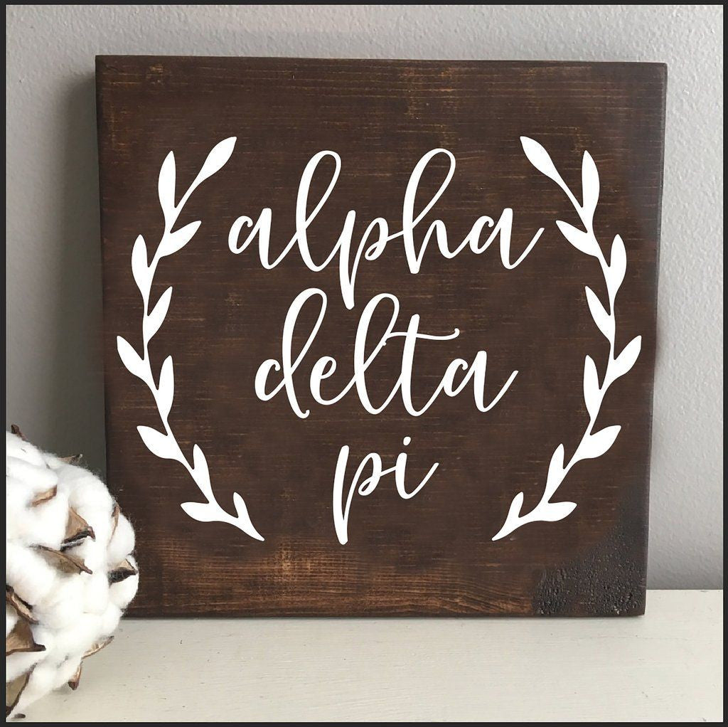 Alpha Delta Pi Wooden Wall Art. Each wooden sign features a brush stroke script with a trendy boho farmhouse design. * Measures 10" W x 10" H x 1.75" D