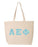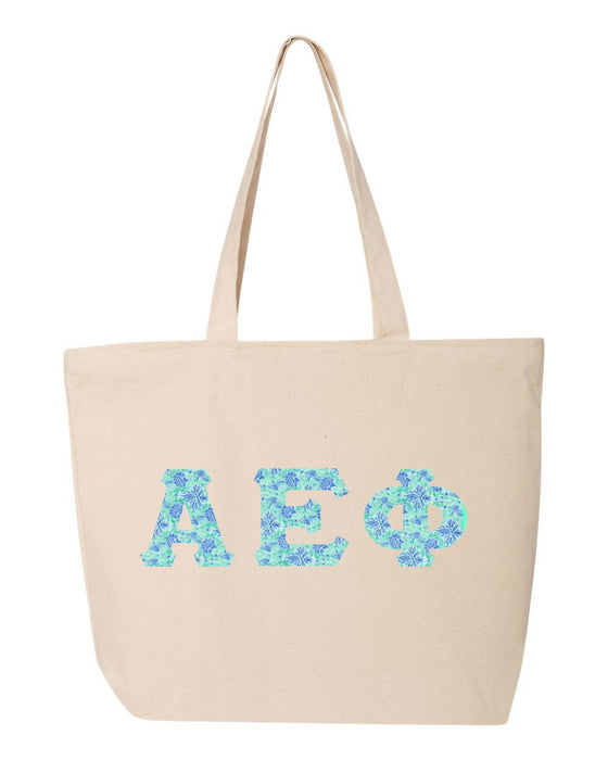 Alpha Epsilon Phi Greek Letter Zipper Tote made of 12.0 oz., 100% heavy cotton canvas Large main compartment with zippered closure Inside zippered flap pouch pocket 25" self-fabric handles 11" handle drop Bag Size: 20 inches W x 15 inches H x 5 inches D