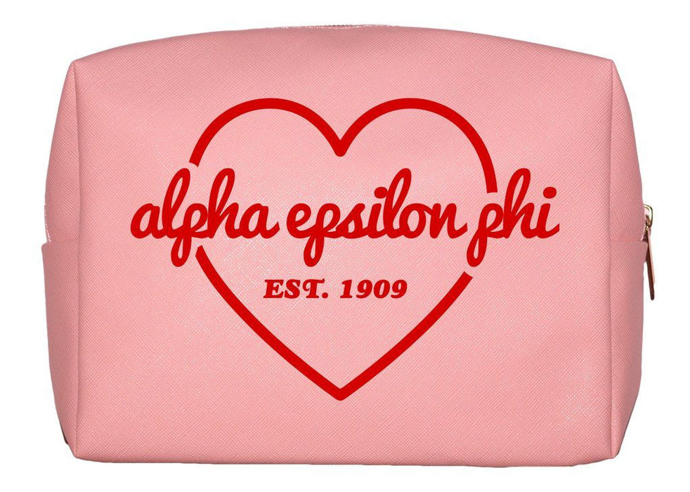 Alpha Epsilon Phi Pink with Red Heart Makeup Bag. With a zipper enclosure to keep all your items secure, and lined in a silky pink fabric with inside pockets for organizing, our bag is a functional, giftable and trendy addition to your sorority swag! Measures 7.5 x 6 x 3.5