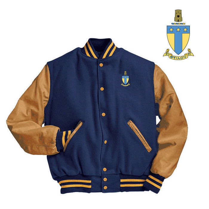 Alpha Tau Omega Varsity Jacket is made of Melton Wool, 24 oz. Genuine leather sleeves and pocket welts Quilted lining Full-snap front High quality rib-trim collar,cuffs, and bottom hem Easy-entry front pocket