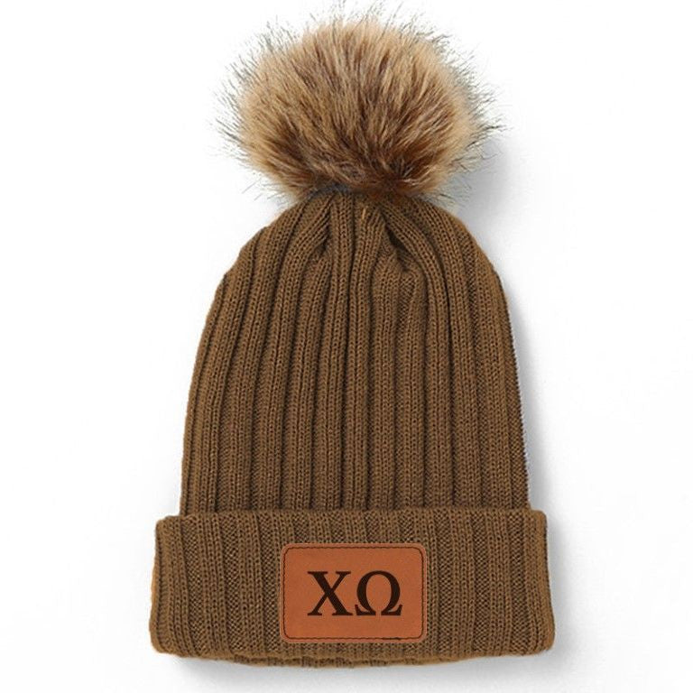 Chi Omega Pom Pom Beanie Hat. Our knit hat is color specific to your organization and features a vegan leather patch embossed with your sorority letters.