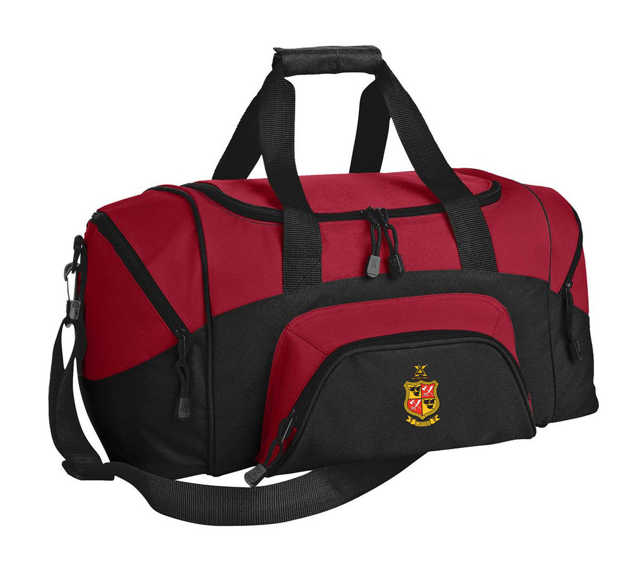 Delta Chi Colorblock Duffel Bag. Duffel Bag features Group Crest in 8 bag color choices. Padded handle Detachable, adjustable shoulder strap Front zippered pocket Two large zippered end pockets Dimensions: 10"h x 20"w x 10.25"d; Approx. 2,050 cubic inches