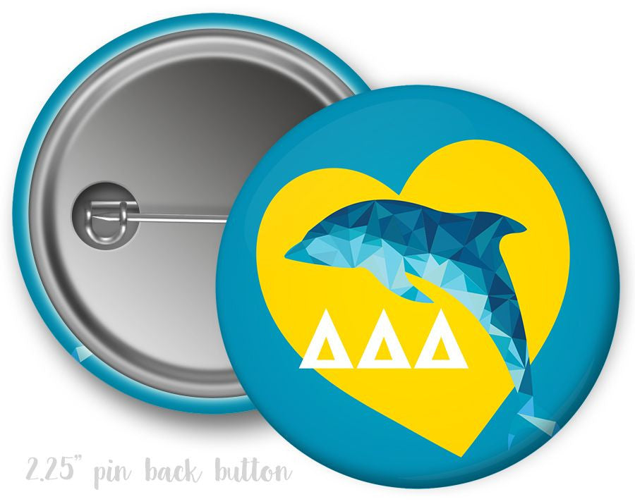 Delta Delta Delta Heart Mascot Button. Standard size 2.25" round pin back style button.