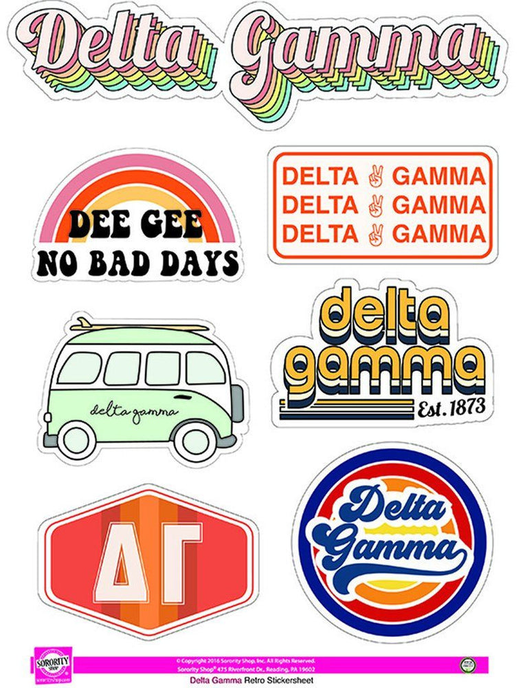 Delta Gamma Retro Sticker Sheet. Each sheet contains 7 stickers! Printed on sturdy vinyl, they are easily removed or repositioned leaving NO STICKY RESIDUE!
