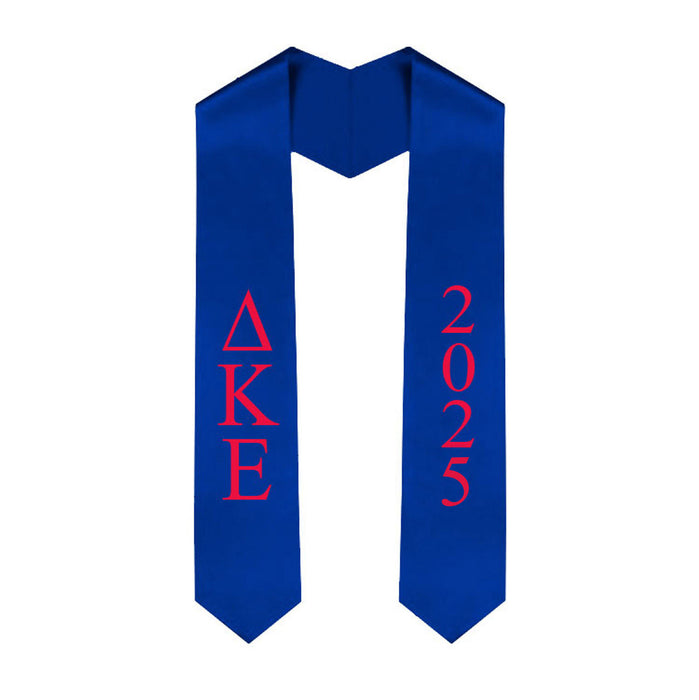Delta Kappa Epsilon Greek Lettered Graduation Sash Stole - Best Value These Graduation Sashes are made of Bridal satin and measures 5" width & 60" or 72" length. *Please Note: Due to the time sensitivity of this item, stoles cannot be cancelled or returned.