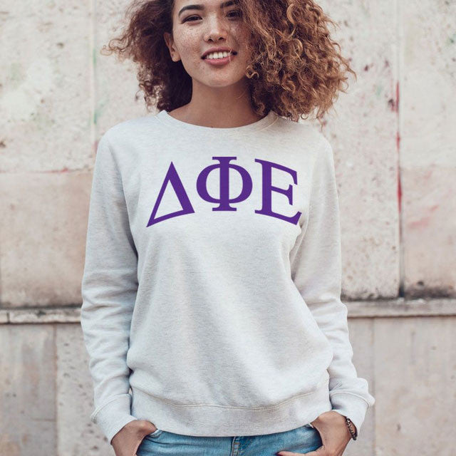 Delta Phi Epsilon Arched Greek Lettered Crewneck Sweatshirt. Sorority Arched Greek Lettered Crewneck Sweatshirt comes printed in your choice of colors. Heavyweight crew neck perfect for a fall day.