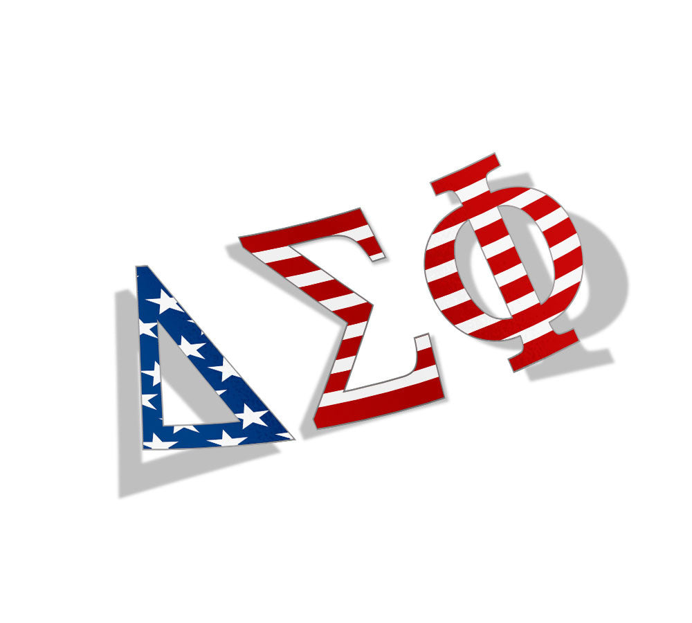 Delta Sigma Phi Greek American Flag Sticker. Support "merica with these awesome American Flag Greek Letter Sticker - 2.5" Tall. The first letter is the beautiful stars and the additional letter or two is the awesome stripes of our American Flag. stickers measure approximately 2.5" tall and are perfect for autos, laptops, water bottles, coolers, boats, doors, etc.