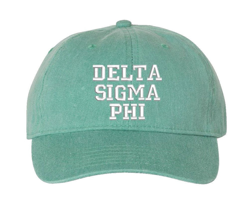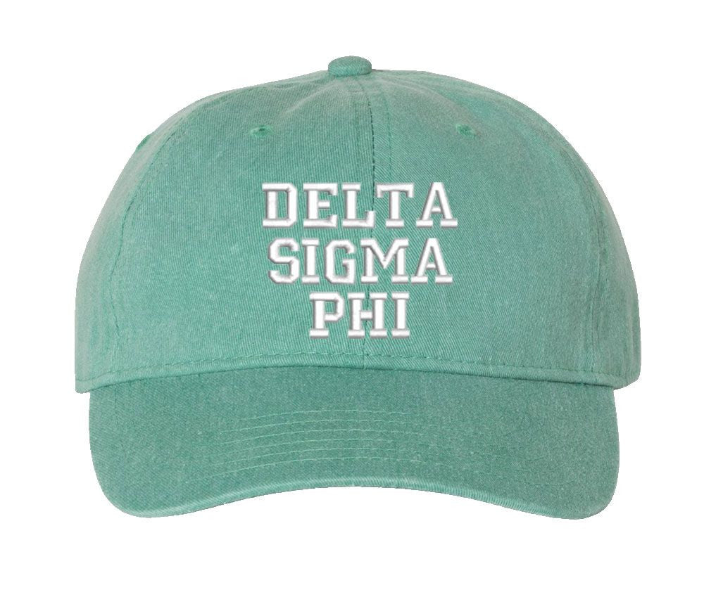 Delta Sigma Phi Pigment Dyed Baseball Cap 100% cotton and comes with Six-panel, six sewn eyelets and a Pre-curved bill. It also has Six rows of stitching on bill with a Self-fabric closure with logo antique brass nickle and grommet tuck-in Adjustable (circumference 22 3/4)