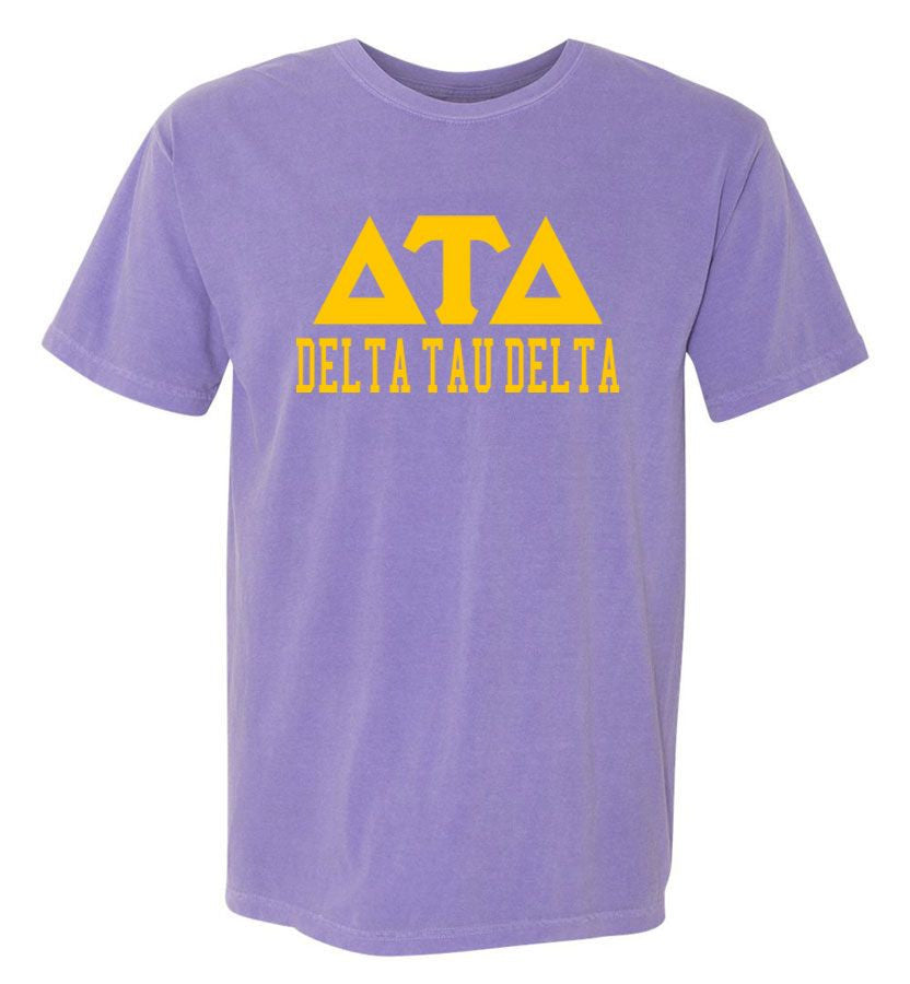 Delta Tau Delta Greek Custom Comfort Colors Heavyweight T-Shirt. 6.1 oz., 100% ring spun cotton Soft-washed garment-dyed fabric Double-needle collar Twill taped neck and shoulders Double-needle armhole, sleeve and bottom hems. *Please note: Due to supply issues, we may need to substitute brands of similar value. Printed item.