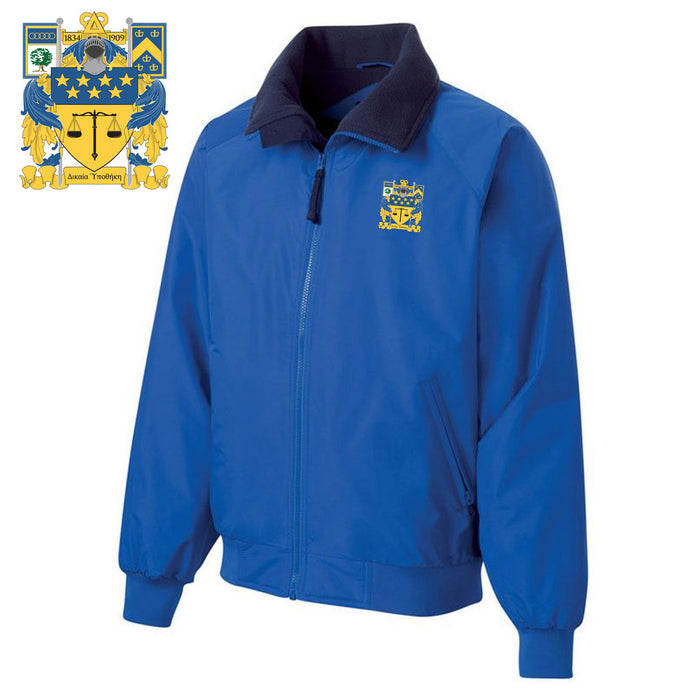 Everyone simply loves the Delta Upsilon Challenger Jacket. This traditional design never goes out of style and keeps you warm, dry and confident. OUR JACKETS ARE UNISEX UNLESS NOTED. Teklon® nylon shell is durable and water repellent Poly-filled body with heavyweight fleece lining for extra warmth Rib knit waistband and cuffs Lower slash pockets, interior pocket (all with zip closures) Nylon lining in the sleeves Port Pocket™ engineering gives easy access for left chest embroidery