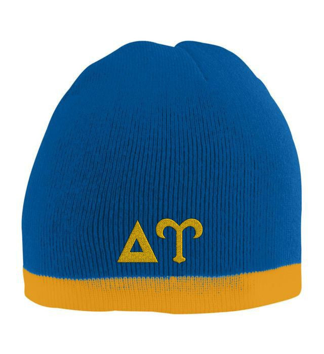 Delta Upsilon Two Tone Knit Beanie. Two layers of 100% acrylic knit with a Contrasting stripe at bottom. Embroidered in your Greek letters and color.
