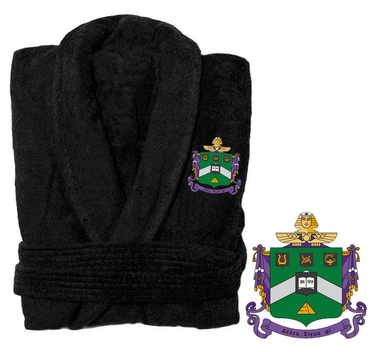 Delta Sigma Phi bathrobe! When it's time to relax, there's nothing sweeter than plush generously cut for comfort. 3/4 length sleeves Two patch pockets at the hips Belt with loops for easy adjustments The material of this 48" long robe extends to about the knee on most average-height wearers. It measures approximately 24 Across the chest. This robe is 12 oz./yd² plush terry velour and it comes in a range of colors, including red, blue, pink, white & more!. It has 3/4 length sleeves and two large patch pockets.